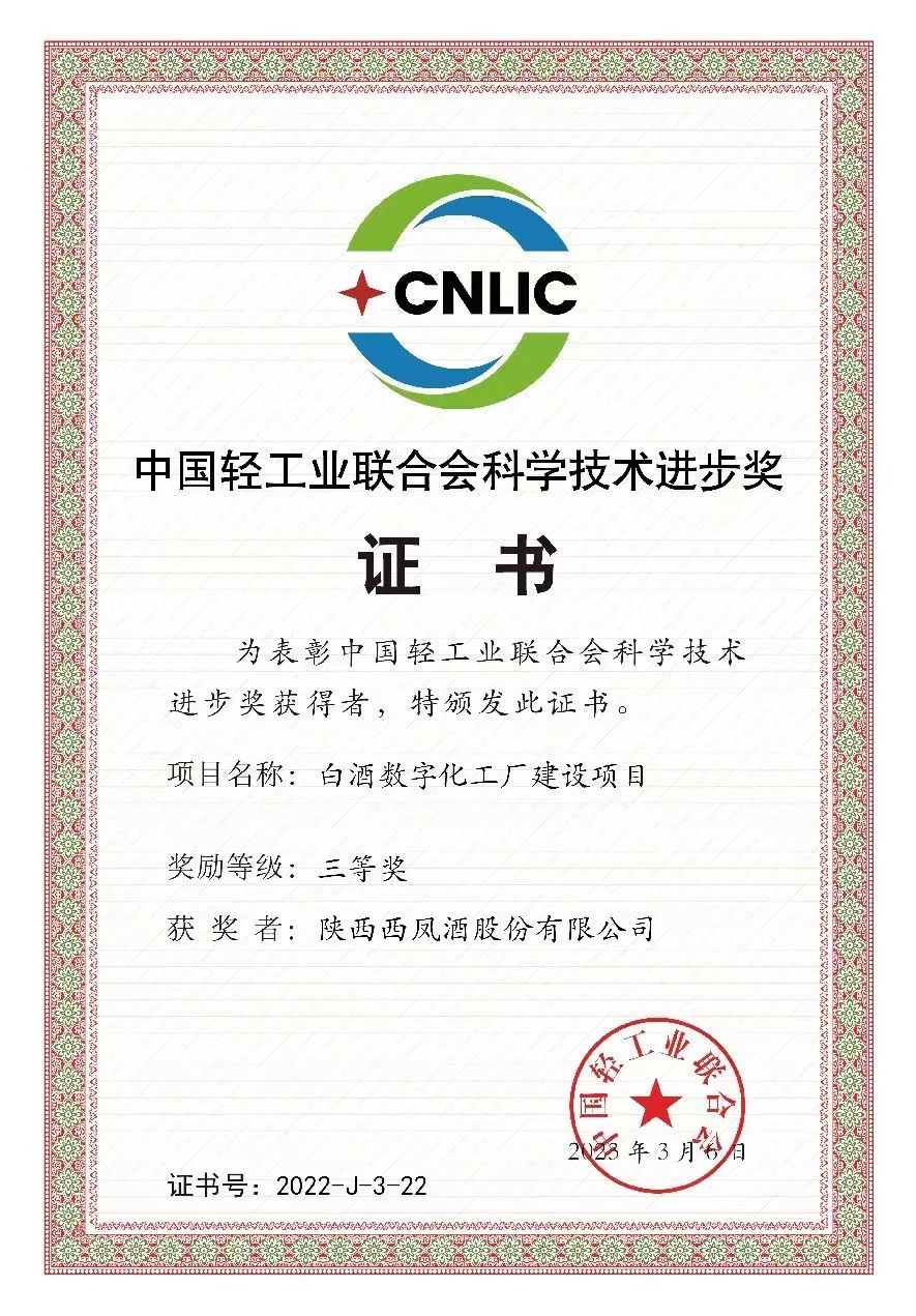 近日,中国轻工业联合会五届三次、中华全国手工业合作总社八届三次理事会在福建厦门召开。会议宣读了《2022年度中国轻工联合会科技奖决定》并举行了颁奖仪式,陕西黄金城酒股份有限公司申报的“白酒数字化工厂建设项目”荣获科学技术进步三等奖。