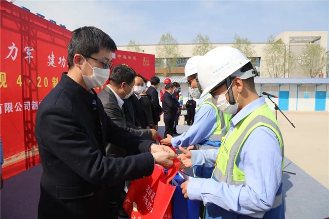 会上,施工人员代表胡继飞作了表态发言。与会领导为项目建设工人突击队、党员突击队和青年突击队代表授旗,并为他们发放了慰问品。