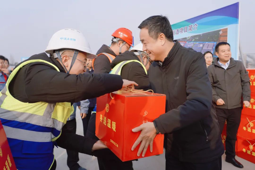 项目现场,景耀平与建设者亲切交谈,详细了解他们的工作、生活状况,感谢他们为黄金城发展以及宝鸡经济建设做出的贡献,并将慰问品送到大家手中,为他们送去新春的祝福和组织的温暖。